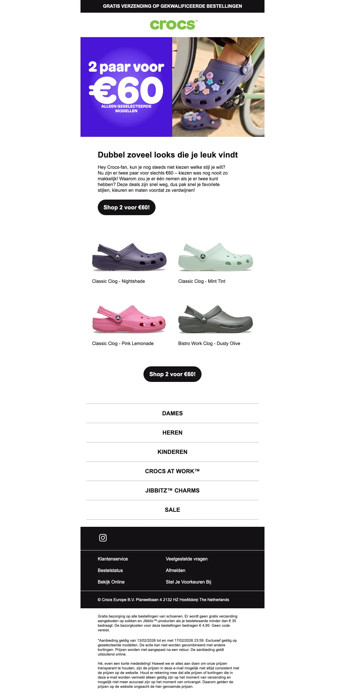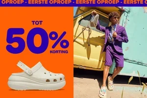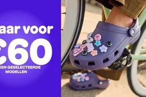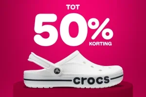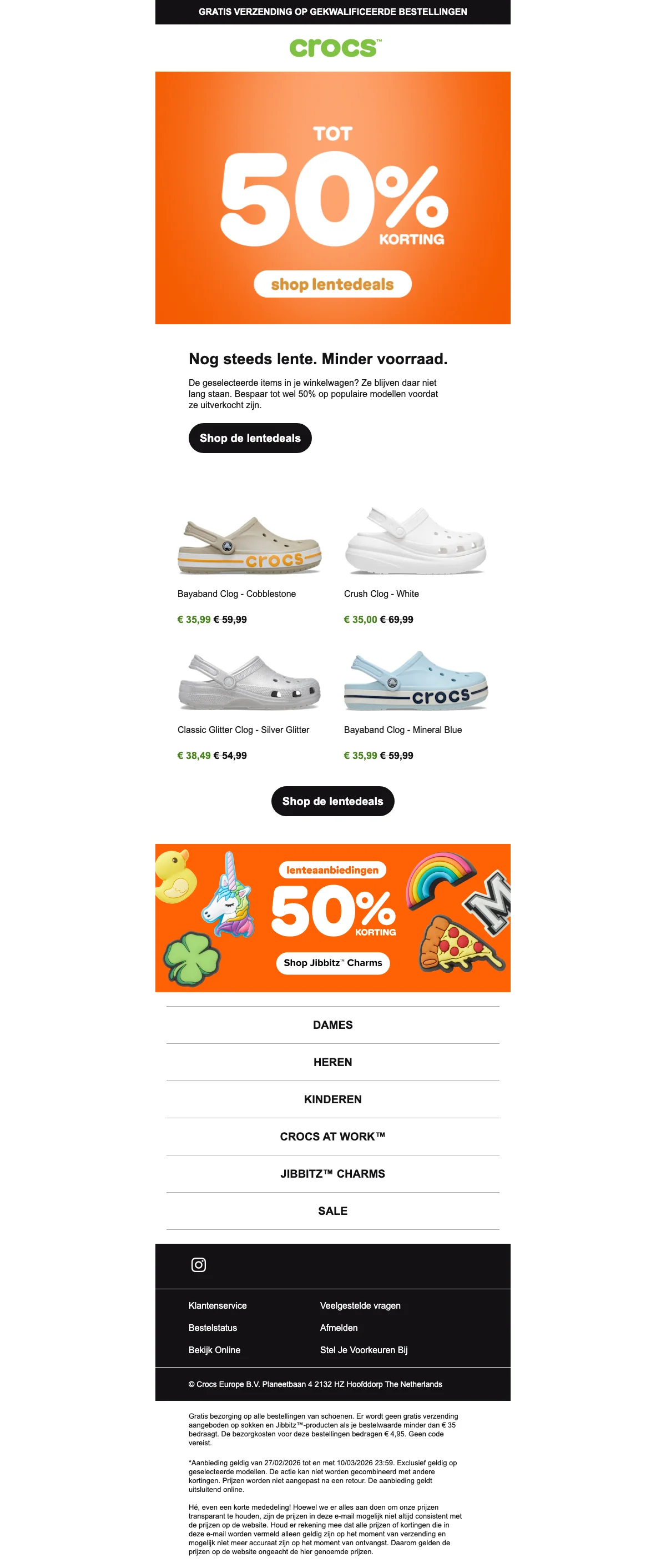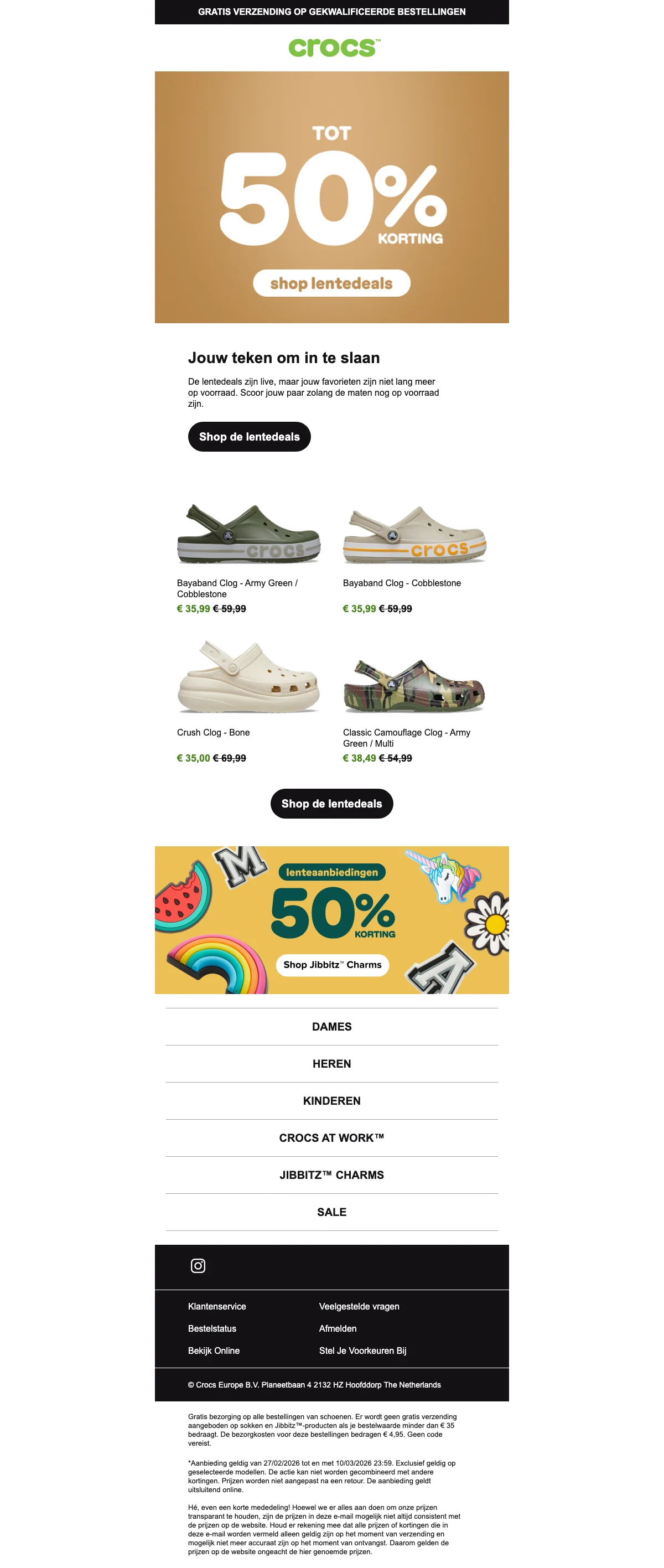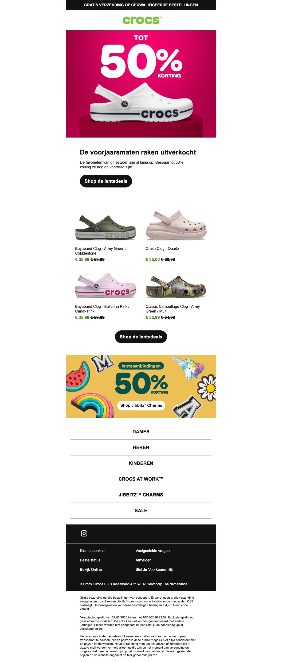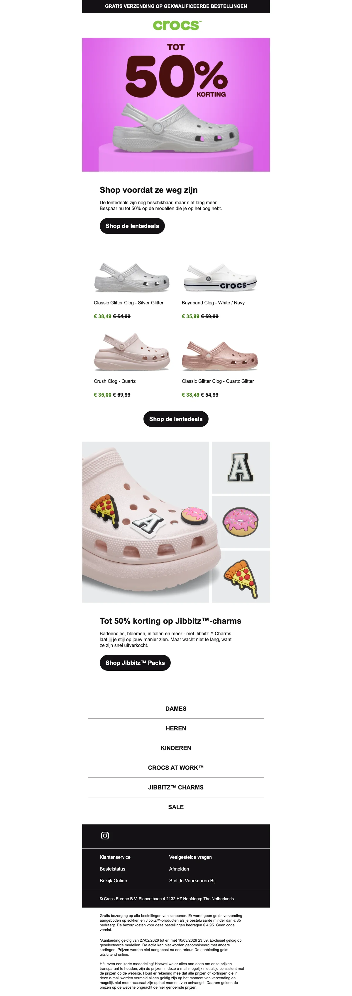 Profiteer van de lentedeals met tot 50% korting op geselecteerde modellen en prijzen vanaf €35. Gratis verzending op schoenen; voor sokken en Jibbitz geldt gratis verzending alleen bij bestellingen vanaf €35, anders €4,95. Geen code nodig; actie alleen online.